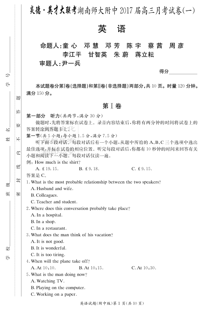 【英語】炎德英才大聯(lián)考2017師大附中高三1次月考