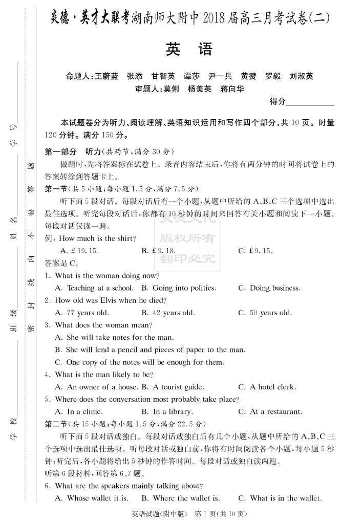 【英語】炎德英才大聯(lián)考2018師大附中高三2次月考