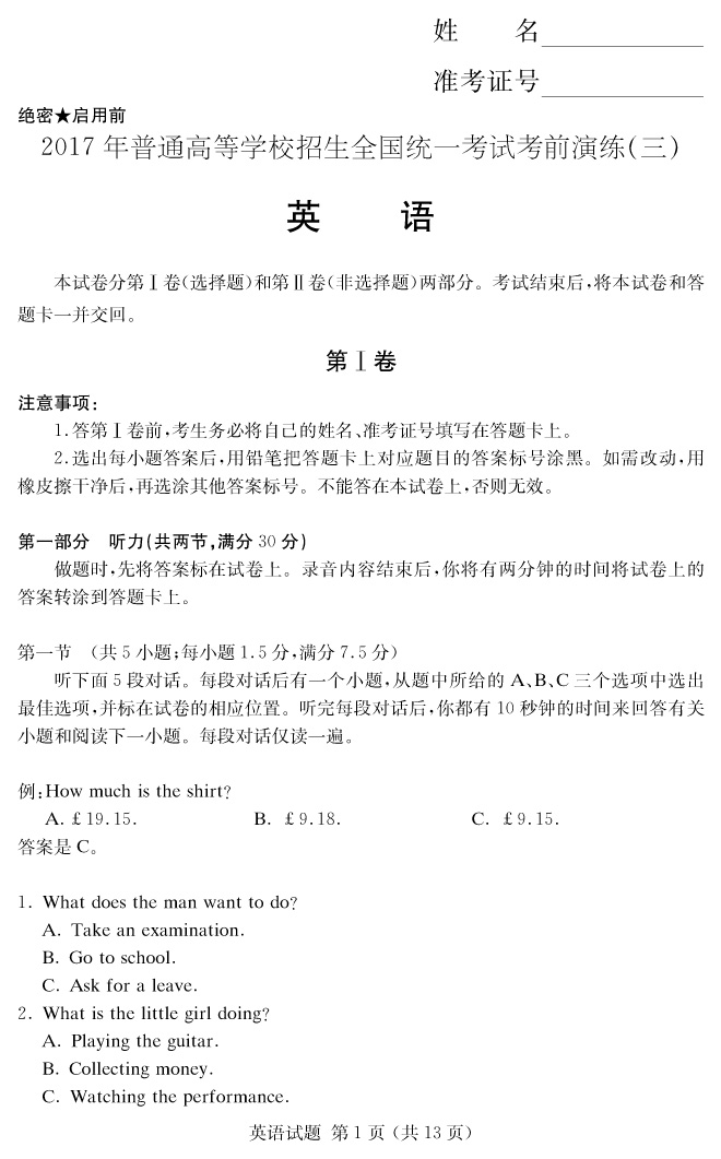 【英語(yǔ)】2017年普通高等學(xué)校招生全國(guó)統(tǒng)一考試考前演練(三)