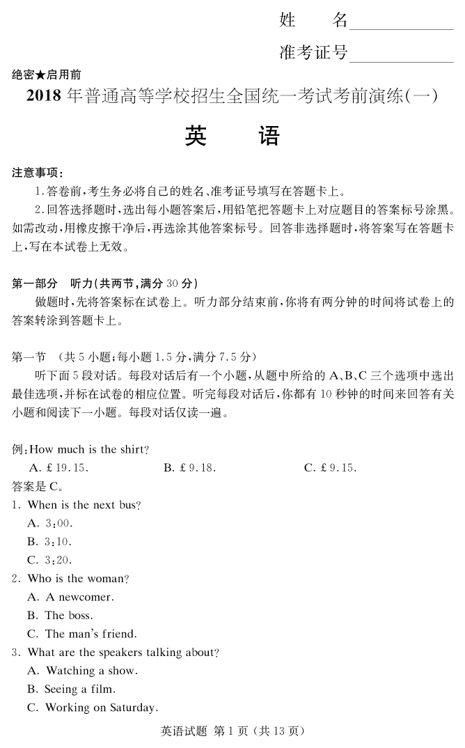 【英語】2018年普通高等學(xué)校招生全國統(tǒng)一考試考前演練(一)