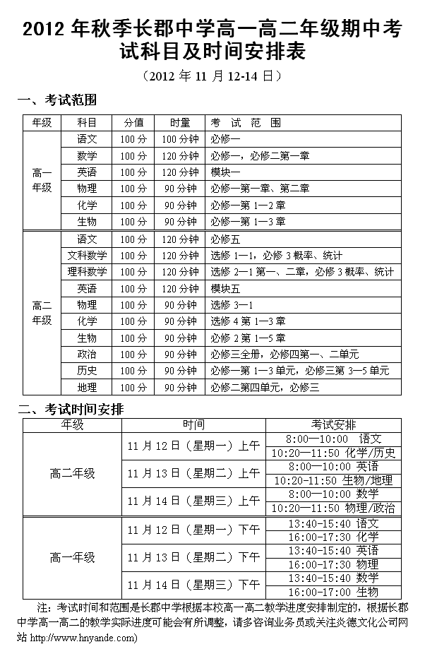 2012年秋季長(zhǎng)郡中學(xué)高一高二期中考試時(shí)間安排(2012.111.12-14)
