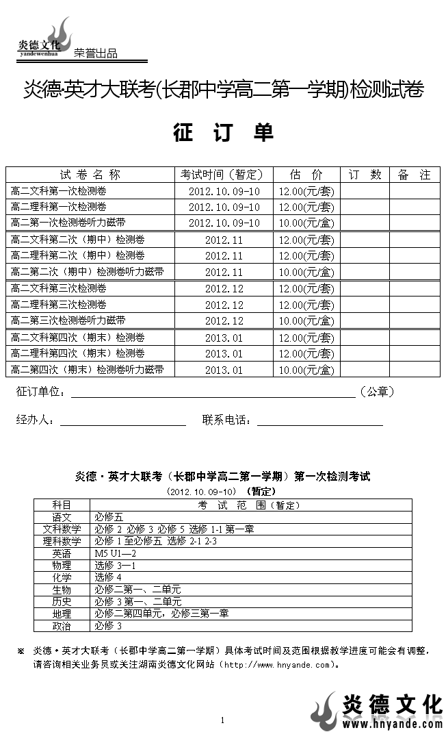 2012年秋季長(zhǎng)郡中學(xué)高二月考時(shí)間范圍訂單(2012.10-2013.01)