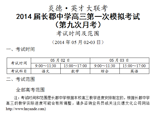 炎德英才大聯(lián)考長(zhǎng)郡中學(xué)2014屆高三第一次模擬(第9次月考)考試時(shí)間和范圍(2014.05.0