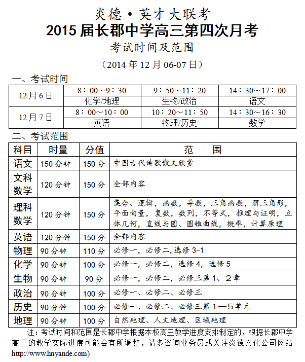 炎德英才大聯(lián)考長(zhǎng)郡中學(xué)2015屆高三第4次月考考試時(shí)間和范圍(2014.12.06-07)