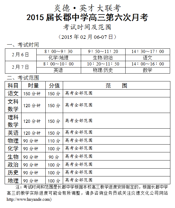 炎德英才大聯(lián)考長郡中學(xué)2015屆高三第6次月考考試時(shí)間和范圍(2015.02.06-07)