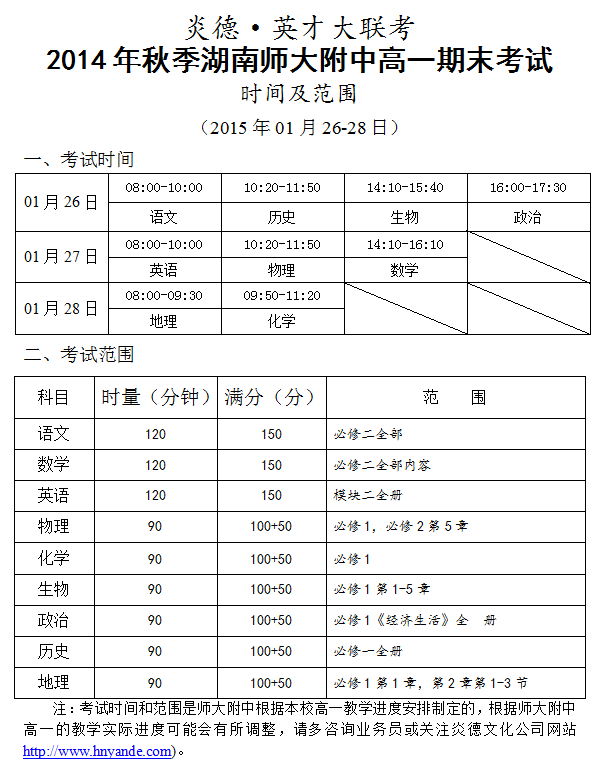 炎德英才大聯(lián)考2014年秋季湖南師大附中高一期末月考考試時(shí)間和范圍(2015.01.26-28)