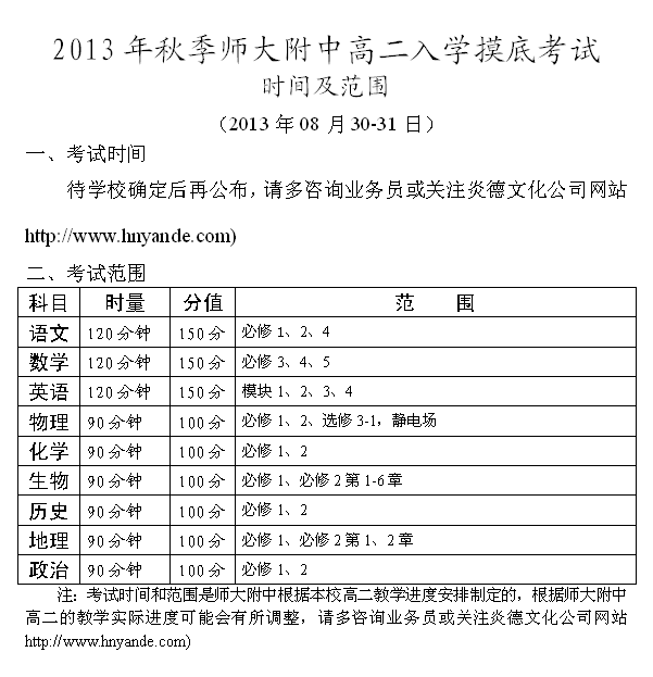 上一篇:炎德英才大聯(lián)考師大附中2013年高二摸底考試時間和范圍(2013.07.12-13)
