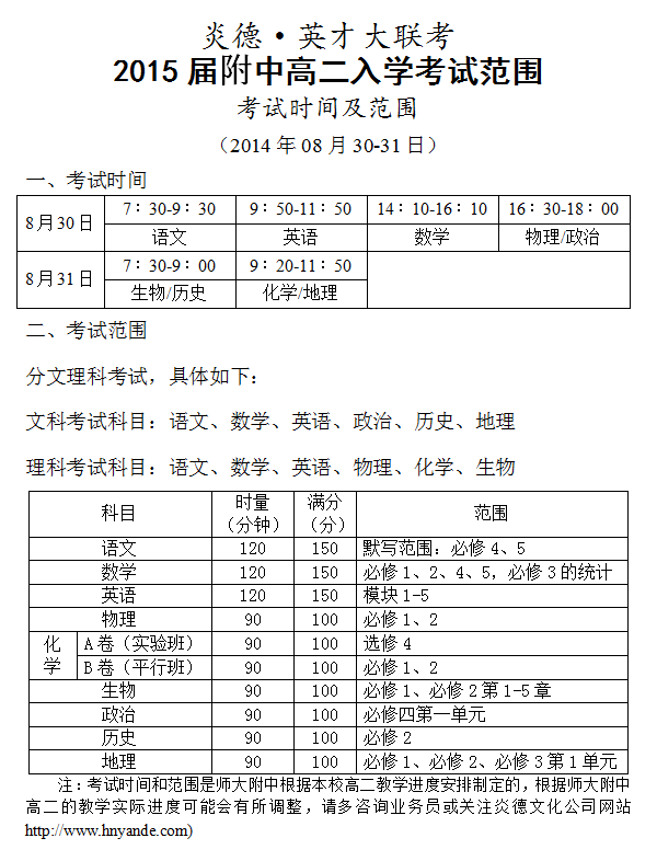 炎德英才大聯(lián)考師大附中2014年秋季湖南師大附中高二入學(xué)摸底考試時(shí)間和范圍(2014.08.30-31)