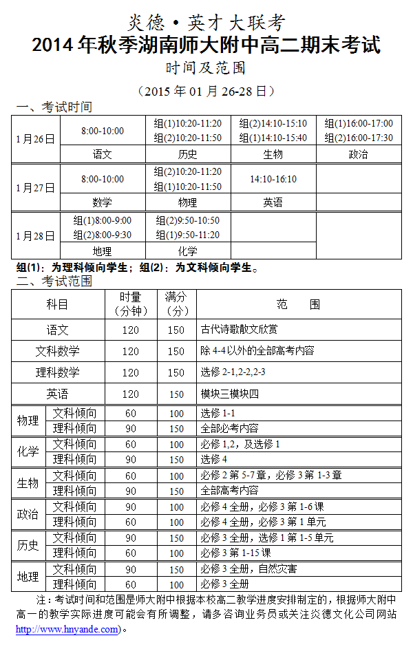 炎德英才大聯(lián)考2014年秋季湖南師大附中高二期末考試時(shí)間和范圍(2015.01.26-28)