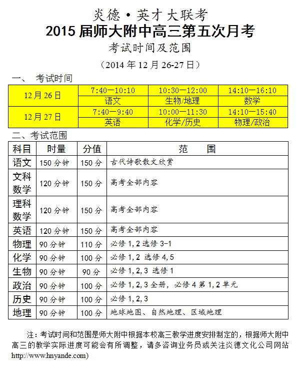 炎德英才大聯(lián)考師大附中2015屆高三第5次月考考試時(shí)間和范圍(2014.12.26-27)