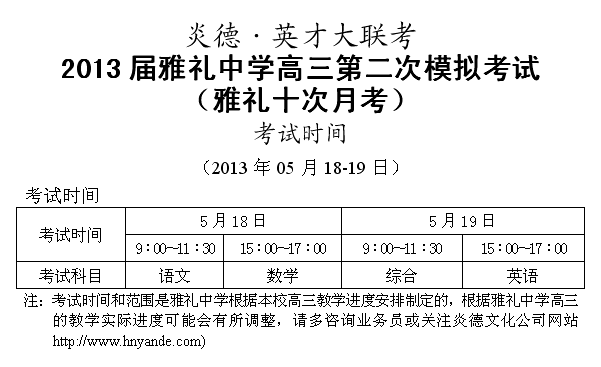 炎德英才大聯(lián)考雅禮中學(xué)2013屆高三第十次月考考試時間和范圍