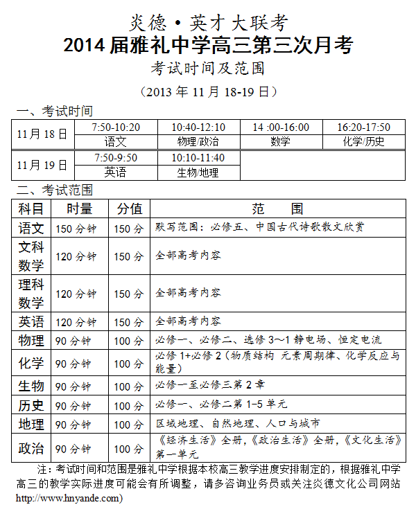 炎德英才大聯(lián)考雅禮中學(xué)2014屆高三第3次月考考試時(shí)間和范圍(2013.11.18-19)