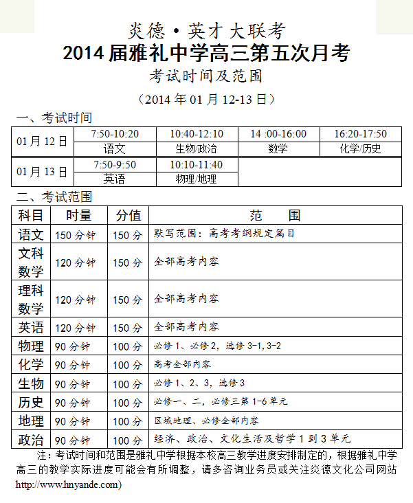 炎德英才大聯(lián)考雅禮中學(xué)2014屆高三第5次月考考試時(shí)間和范圍(2014.01.12-13)