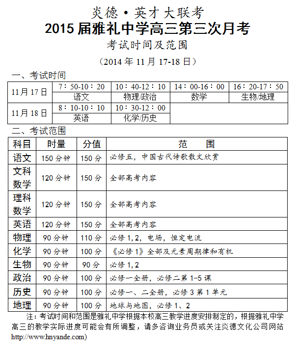 炎德英才大聯(lián)考雅禮中學(xué)2015屆高三第3次月考考試時(shí)間和范圍(2014.11.17-18)