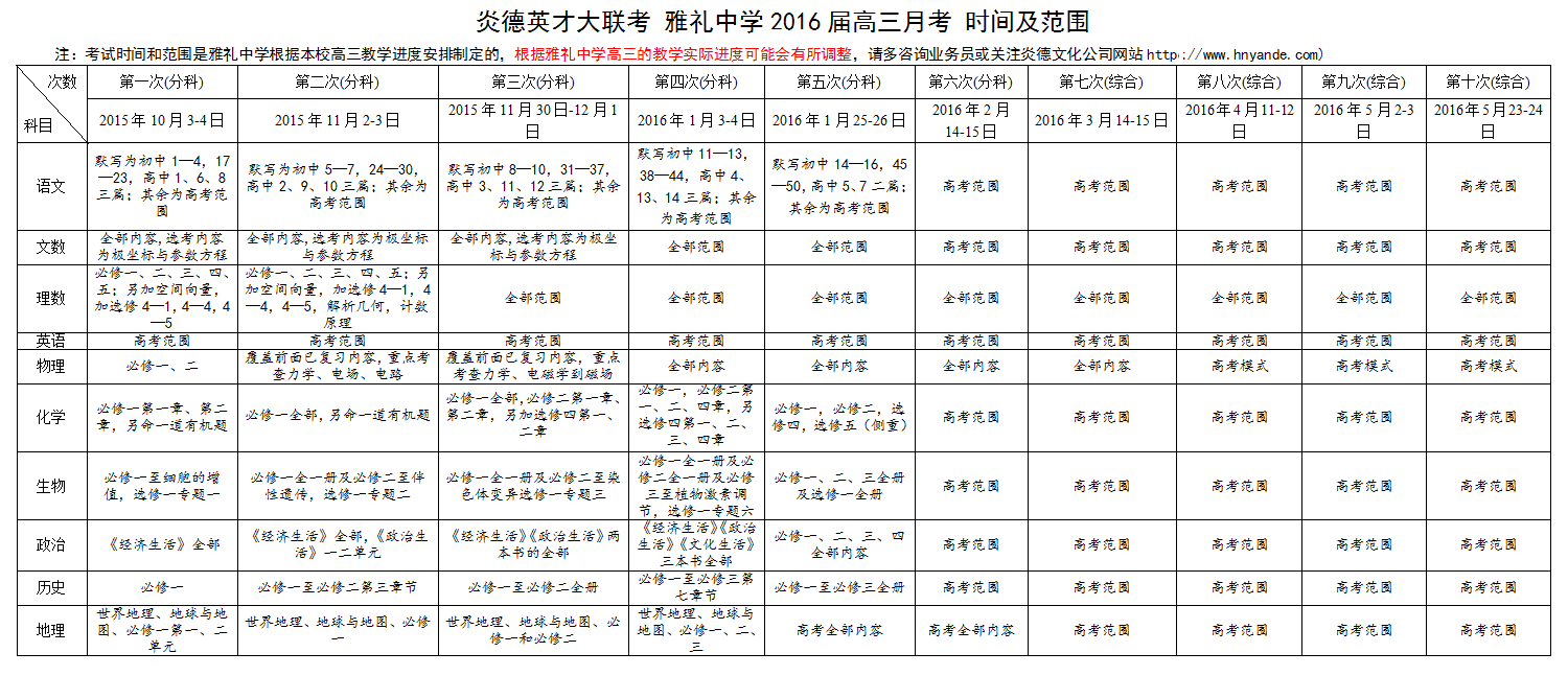 炎德英才大聯(lián)考雅禮中學(xué)2016屆高三月考考試時(shí)間和范圍