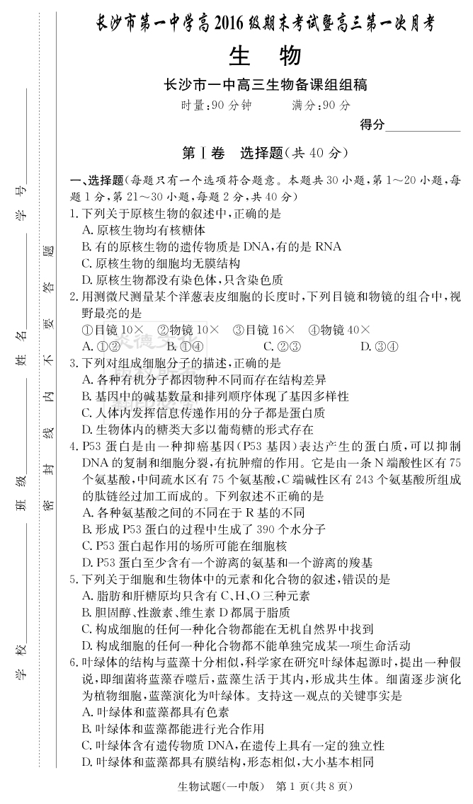 【生物】炎德英才大聯(lián)考2019長沙一中高三1次月考
