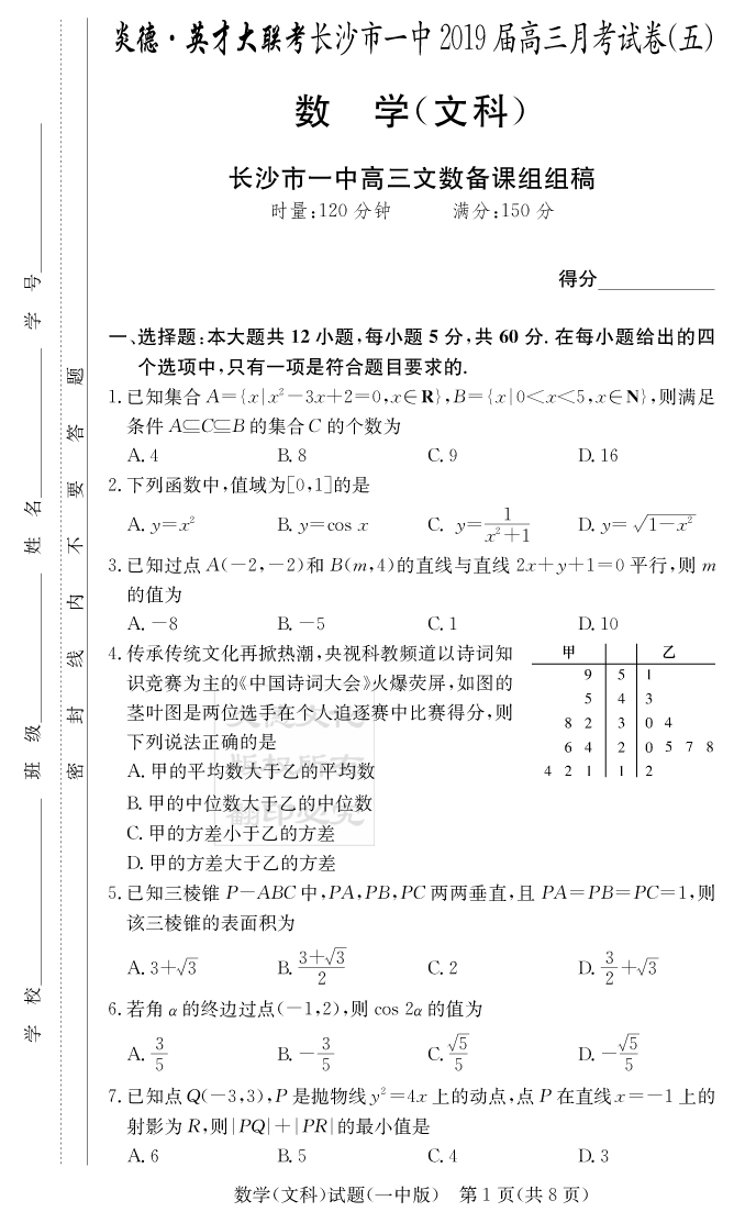 【文數(shù)】炎德英才大聯(lián)考2019長沙一中高三5次月考