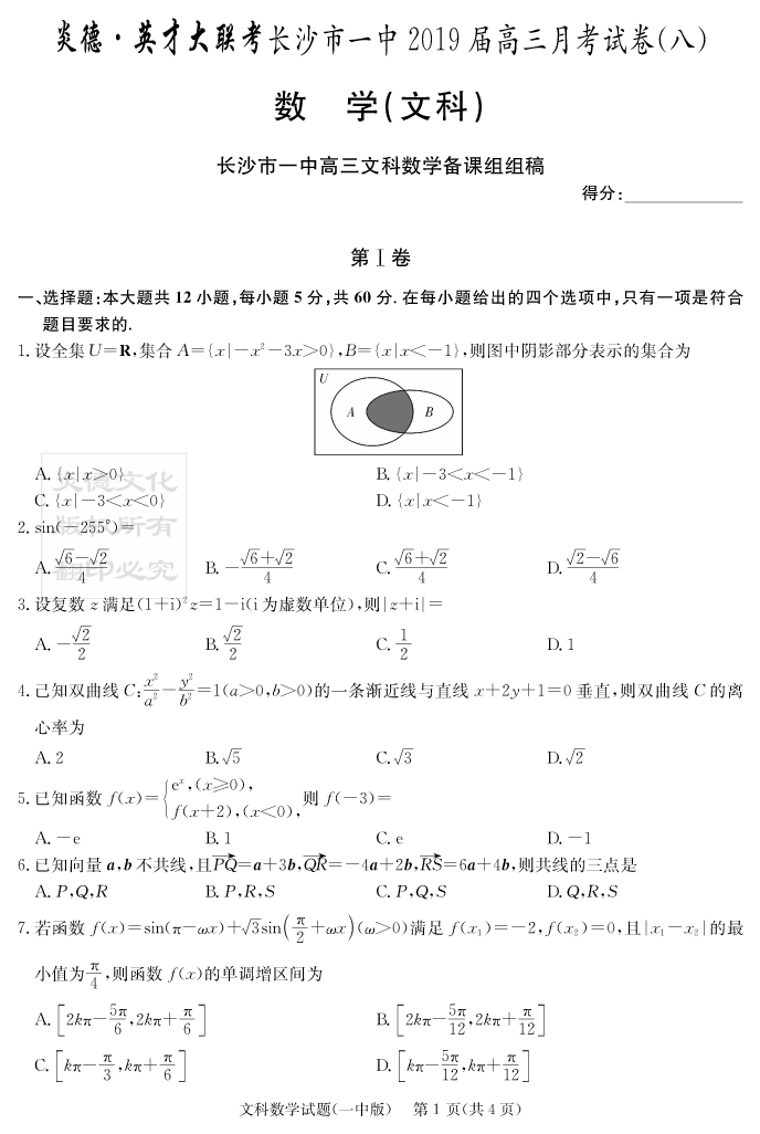 【文數(shù)】炎德英才大聯(lián)考2019長沙一中高三8次月考