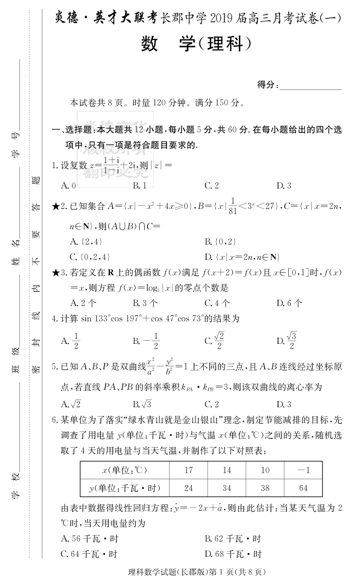【理數(shù)】炎德英才大聯(lián)考2019長郡中學(xué)高三1次月考