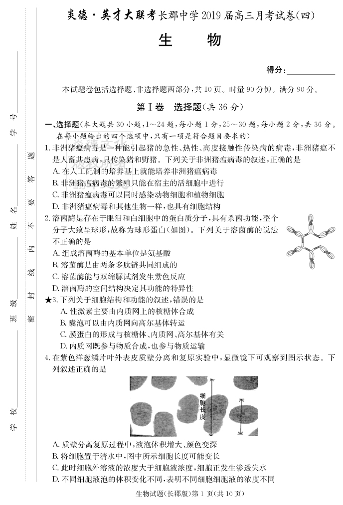 【生物】炎德英才大聯(lián)考2019長郡中學(xué)高三4次月考