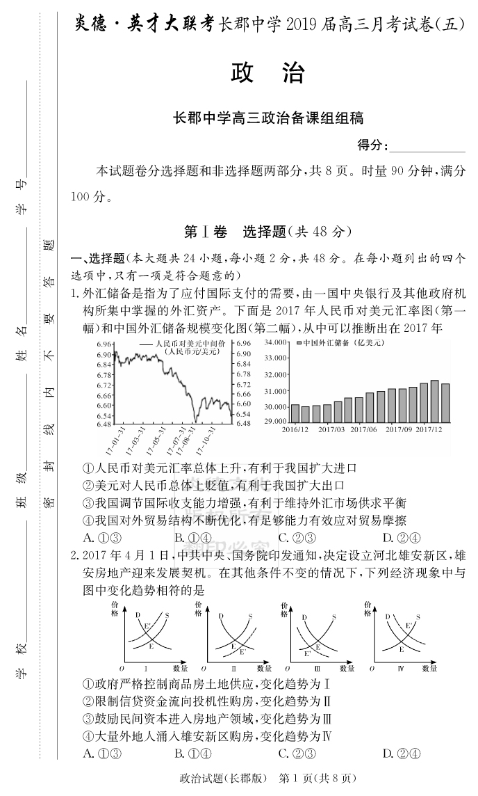 【政治】炎德英才大聯(lián)考2019長(zhǎng)郡中學(xué)高三5次月考
