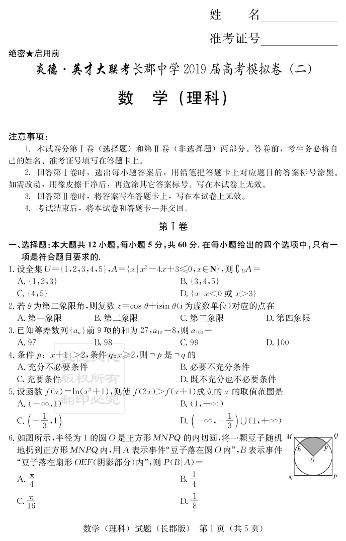 【理數(shù)】炎德英才大聯(lián)考2019長郡中學(xué)高三10次月考(模擬二)