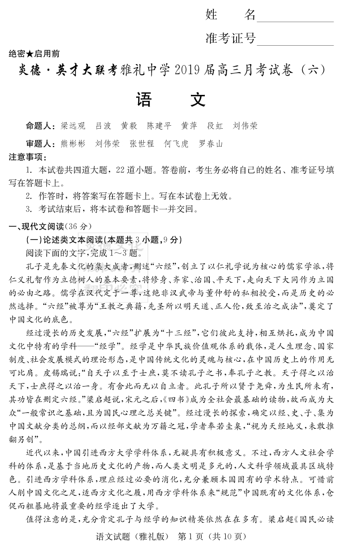 【語文】炎德英才大聯(lián)考2019雅禮中學(xué)高三6次月考