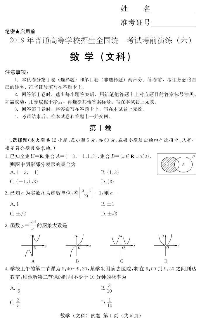 【文數(shù)】2019年普通高等學校招生全國統(tǒng)一考試考前演練(六)
