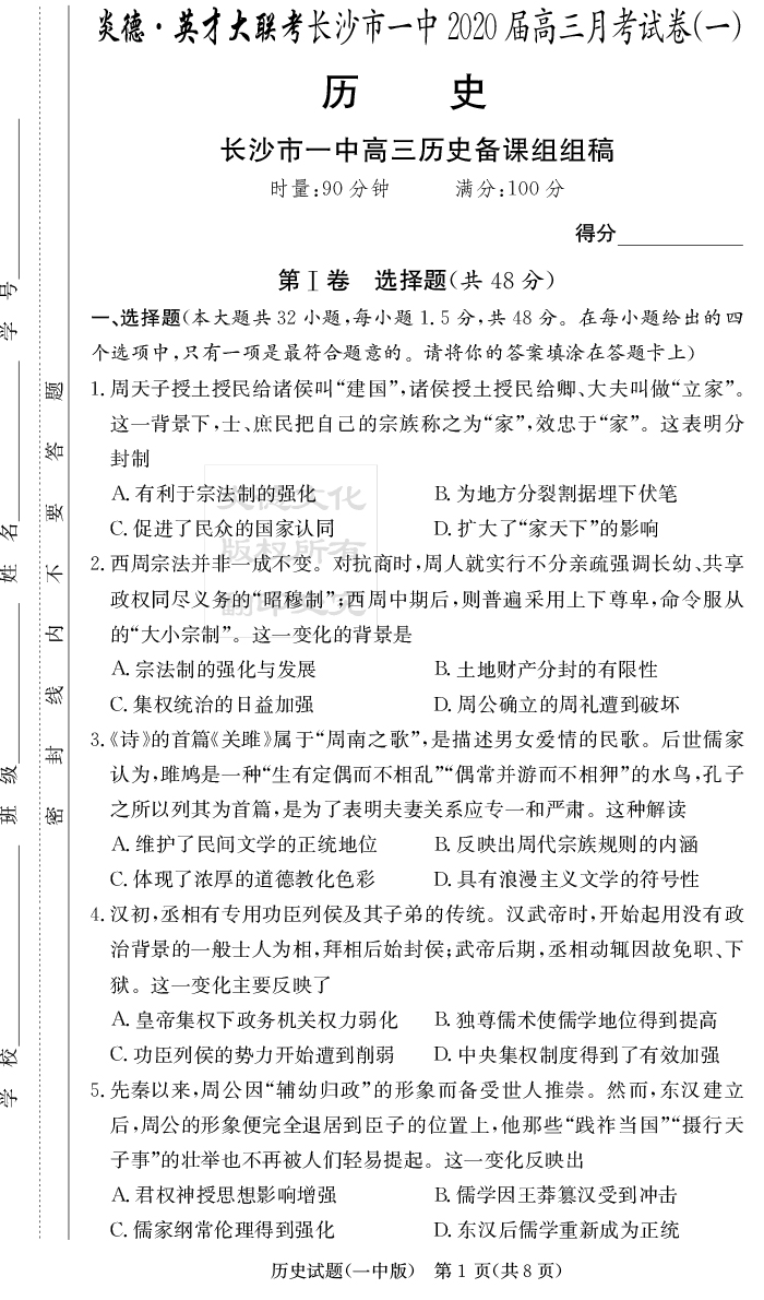 【歷史】炎德英才大聯(lián)考2020屆長(zhǎng)沙市一中高三1次月考