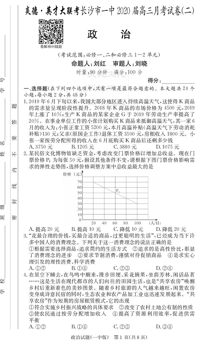 【政治】炎德英才大聯(lián)考2020屆長沙市一中高三2次月考