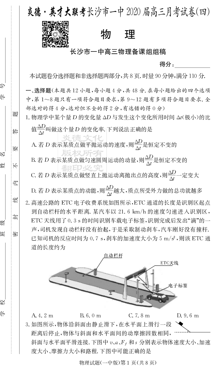 【物理】炎德英才大聯(lián)考2020屆長沙市一中高三4次月考