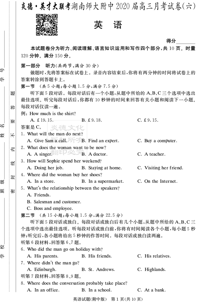 【英語】炎德英才大聯(lián)考2020屆師大附中高三6次月考