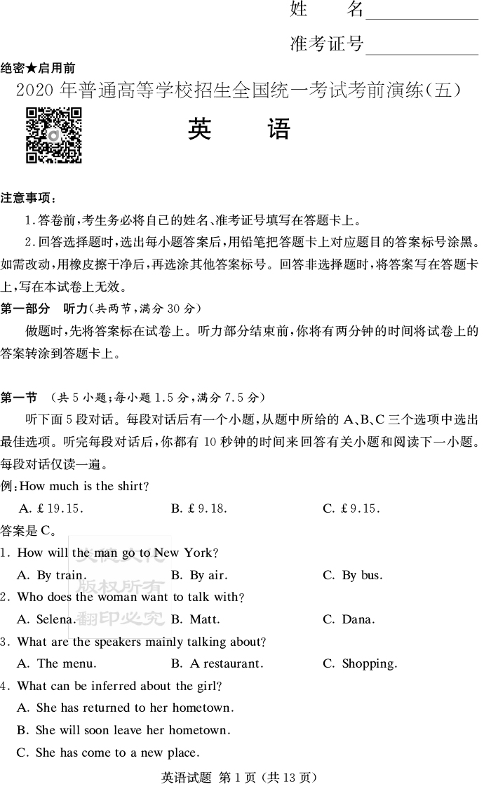 【英語】2020年普通高等學(xué)校招生全國統(tǒng)一考試考前演練(五)