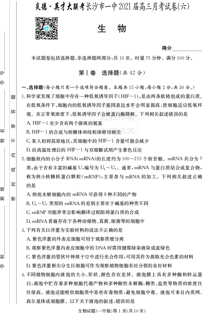 【生物】炎德英才大聯(lián)考2021屆長沙市一中高三6次月考