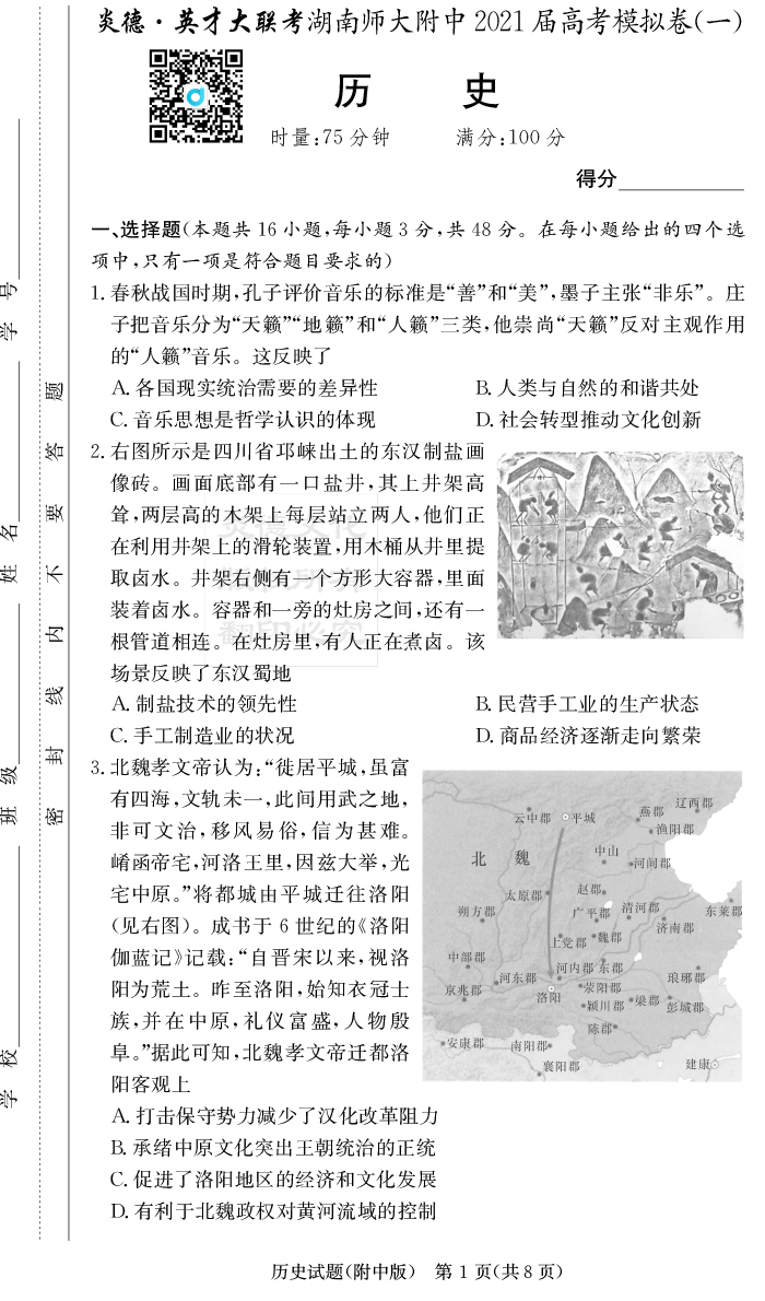 【歷史】炎德英才大聯(lián)考2021屆湖南師大附中高三8次月考(模擬一)