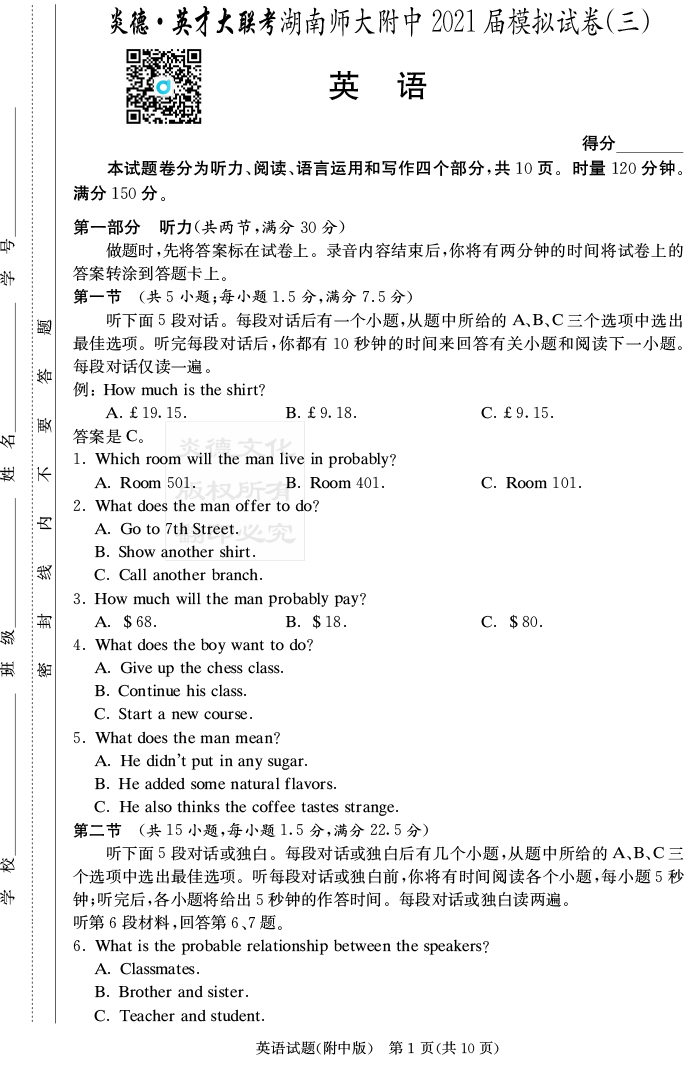 【英語】炎德英才大聯(lián)考2021屆湖南師大附中高三10次月考(模擬三)