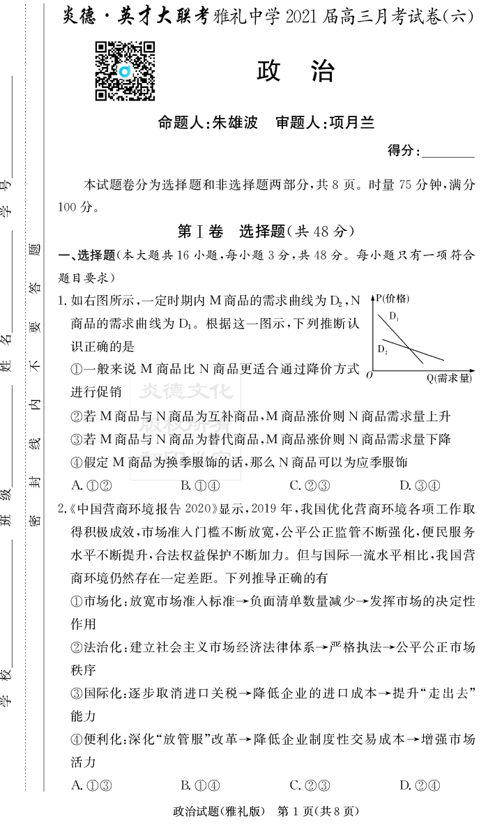 【政治】炎德英才大聯(lián)考2021屆雅禮中學(xué)高三6次月考
