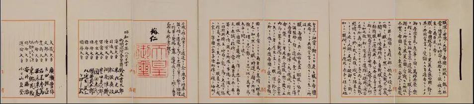 裕仁天皇《終戰(zhàn)詔書》手稿,此份降書是1945年9月2日在東京灣停泊的密蘇里號戰(zhàn)列艦上面簽的。(原件照片)