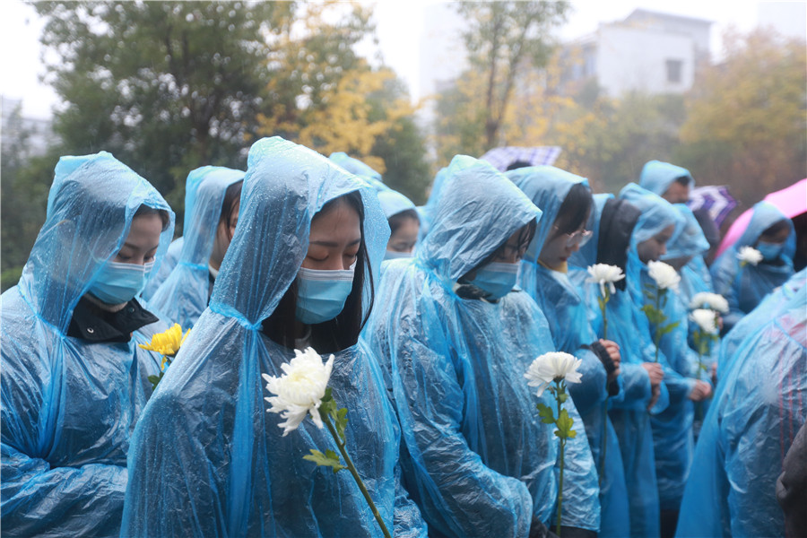 參加活動的市民向抗戰(zhàn)英烈和在抗日戰(zhàn)爭中遇難的平民默哀悼念,并獻上白菊表達哀思。
