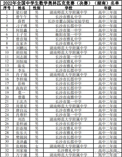 據中國數(shù)學會發(fā)布的官方公布的名單,今年湖南省進入數(shù)學奧林匹克競賽決賽的人數(shù)有33人。