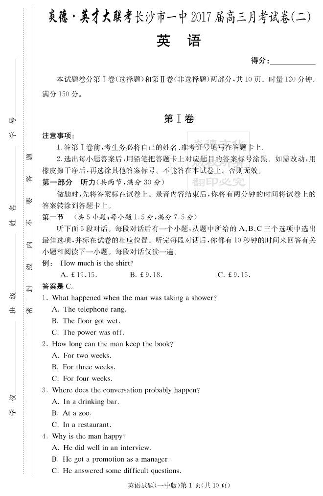 【英語】炎德英才大聯(lián)考2017長沙一中高三2次月考