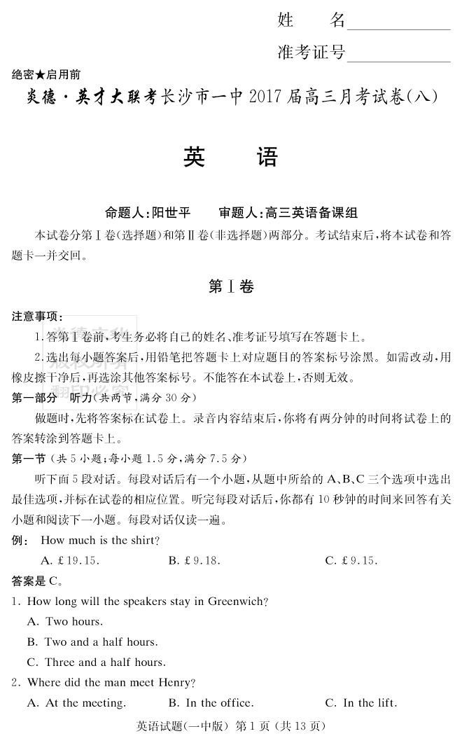 【英語】炎德英才大聯(lián)考2017長(zhǎng)沙一中高三8次月考
