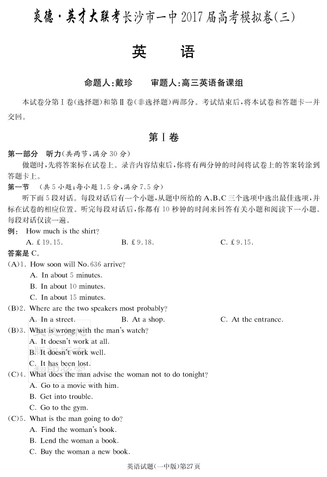 【英語】炎德英才大聯(lián)考2017長沙一中高三12次月考(模擬三)